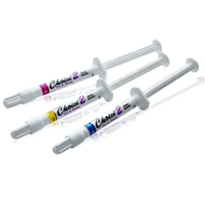 Système Choice 2 Starter Kit. Ciment résine photopolymérisable pour facettes. Stabilité de teinte absolue (Delta E < 1.2). Contient : Seringues de ciment, Pâtes d'essai (Try-in), Adhésif, Porcelaine Etch, Silane.