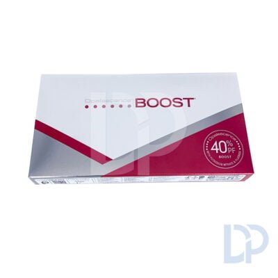 Opalescence Boost 40%. Gel de blanchiment au fauteuil puissant (40% peroxyde d'hydrogène). Activation chimique (sans lampe). Seringue "Jet Mix" pour un mélange frais. Contient PF (Nitrate de Potassium + Fluor). Résultats en 1h.