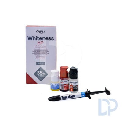 Whiteness HP Maxx. Évolution du Whiteness HP. Gel de blanchiment 35% HP avec système de mélange optimisé. Contient un bouclier thermique. Peut être activé par la lumière pour accélérer le processus. Kit complet pour 3 patients.