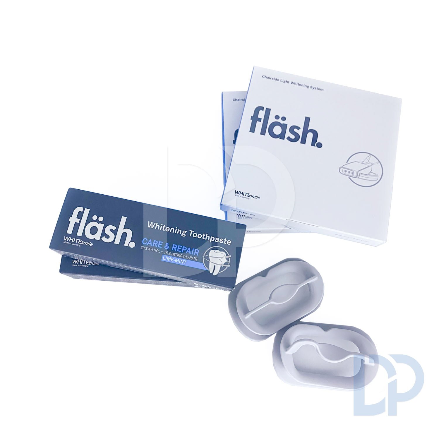 Kit fläsh Whitening (2 Patients). Système de blanchiment au fauteuil optimisé pour l’activation par la lampe fläsh. Gel de peroxyde d’hydrogène à 32% contenant de la chlorophylle photo-active. Résultats rapides et brillants.